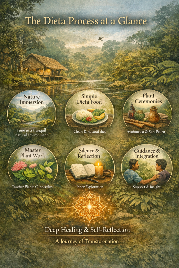 During a dieta, participants simplify their environment, follow a specific diet, and work with a teacher plant while spending time in silence and reflection.
