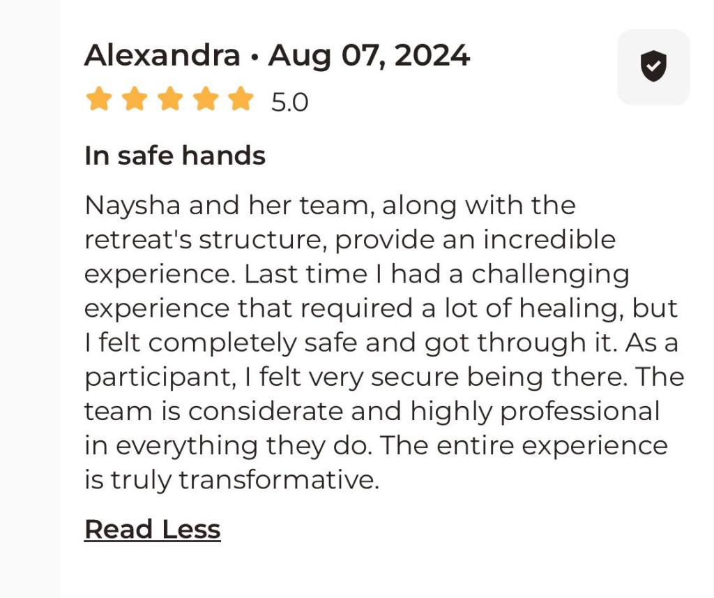 A month before the retreat, you will have the opportunity for a preparation call with Naysha Silva.