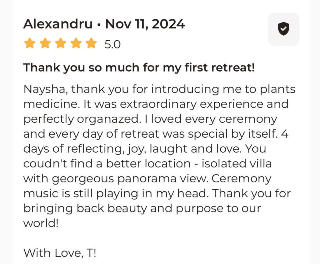 An expert in Ayahuasca, San Pedro and Kambo ceremonies, Naysha also practices soul retrieval techniques, healing and more. Her mission was further enhanced by a life-changing encounter with Archangel Raphael, who urged her to share the medicine with the world.